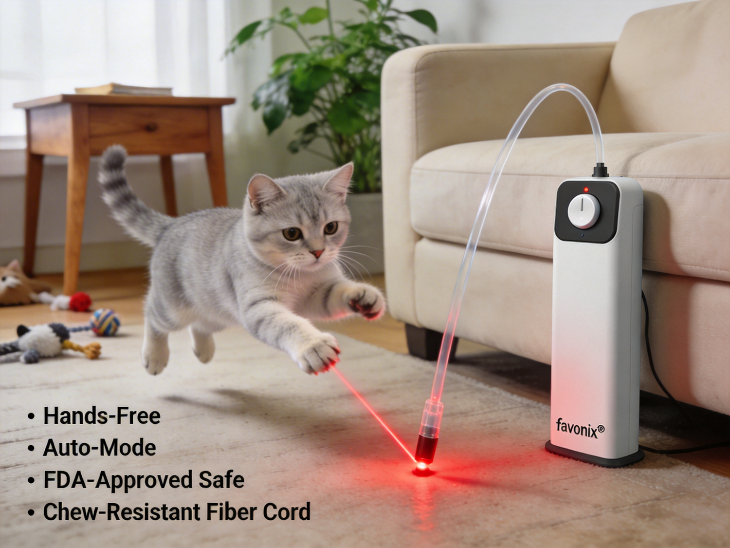 Tired of coming home to chewed couch edges, toppled decor, and a cat bouncing off walls from boredom? The favonix® Cat Laser Toy fixes that instantly—flip it on, and your feline friend locks onto the bright, darting dot in seconds, redirecting their zoomies from your furniture to hours of healthy, pouncing fun. Use it while curled up on the couch after work, sipping coffee on lazy weekends, or during quick work breaks; the hands-free auto-mode cycles through random patterns so you can relax while they play. Our FDA-approved laser module is 100% safe for your cat’s sensitive eyes, and the tough, chew-resistant fiber cord stands up to even the most aggressive pounces and gnaws, lasting way longer than flimsy alternatives.